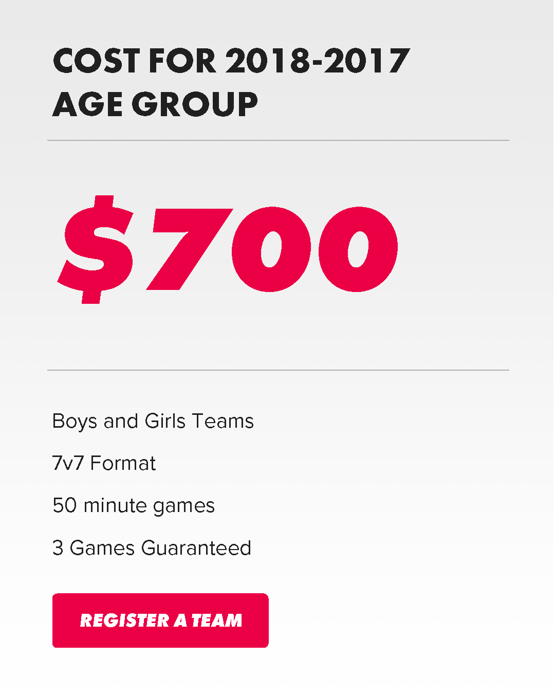 *There are no refunds once your team is accepted. Pricing does not include the $20 dollar GotSport Registration Fee.